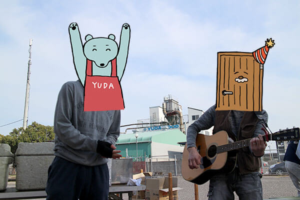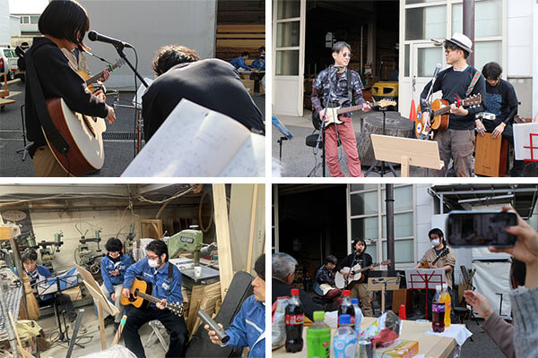 ユダ木工では、20代から70代まで幅広い年齢層の従業員が、一つのチームとなって木製ドア造りの仕事をしています。音楽クラブのメンバーも、ベテランから新入社員まで様々です。立派にボーカル&ギターをつとめる若手社員を皆で応援しました。